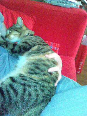 My boss' cat Cass who upon my arrival always like to spend a few minutes being scratched on my lap. She's gorgeous too; a stray turned luxury kitten -